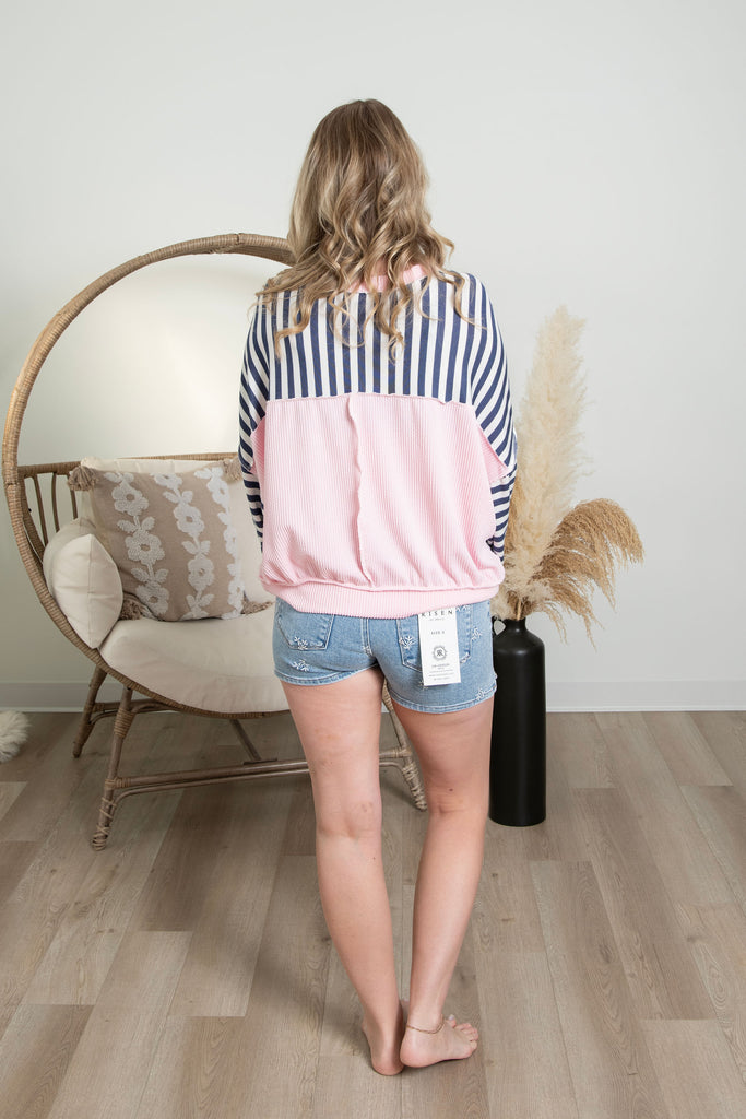 Love the look of designer pieces without breaking the bank? This oversized striped top is your answer. Navy and blush pink stripes give major style points, and the relaxed fit is seriously comfortable for everyday wear. Throw it on with jeans, layer it up, or wear it solo—it works for everything. Simple, cute, and totally wearable.