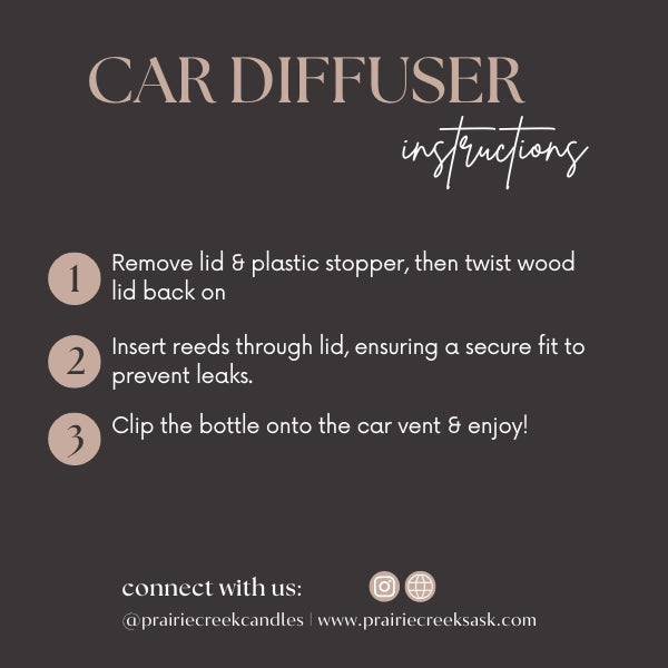 * Diffuse: Insert the diffuser sticks into the cap. Attach the clip to your car vent, ensuring the diffuser is upright (do not tilt forward or backward) and let it work its magic. Care Instructions: