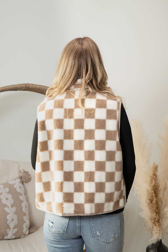 Get ready to fall head over heels for this adorable Alpine Sherpa Vest! Dressed in a sweet mocha brown checkered pattern, this fluffy sherpa-lined essential is basically a wearable cuddle. Layer it over anything and instantly elevate your vibe with cozy sophistication and undeniable charm. From crisp autumn mornings to breezy spring evenings, this vest is your trusty sidekick for looking effortlessly cute while staying toasty warm. It's the kind of piece that makes you smile every time you put it on!