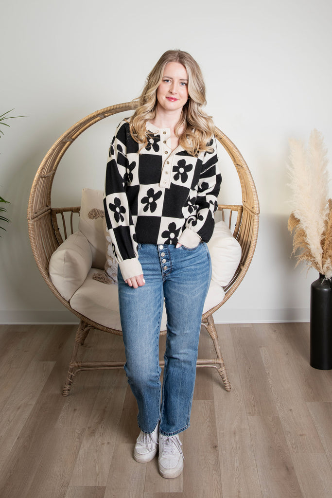 Embrace your quirky side with this charming Flower Power Sweater! Featuring a bold checkered pattern adorned with delicate floral accents, it's a statement piece that blends retro vibes with modern style. Functional buttons make layering effortless, while the playful design keeps things fun and fresh. Perfect for anyone who loves standing out with personality and flair.