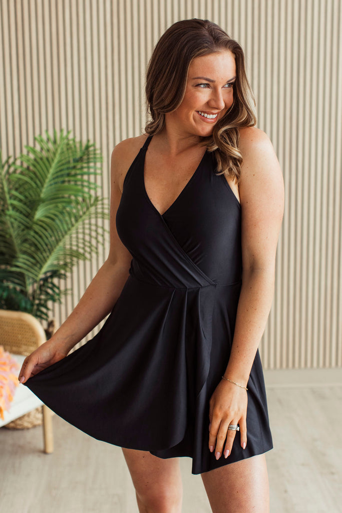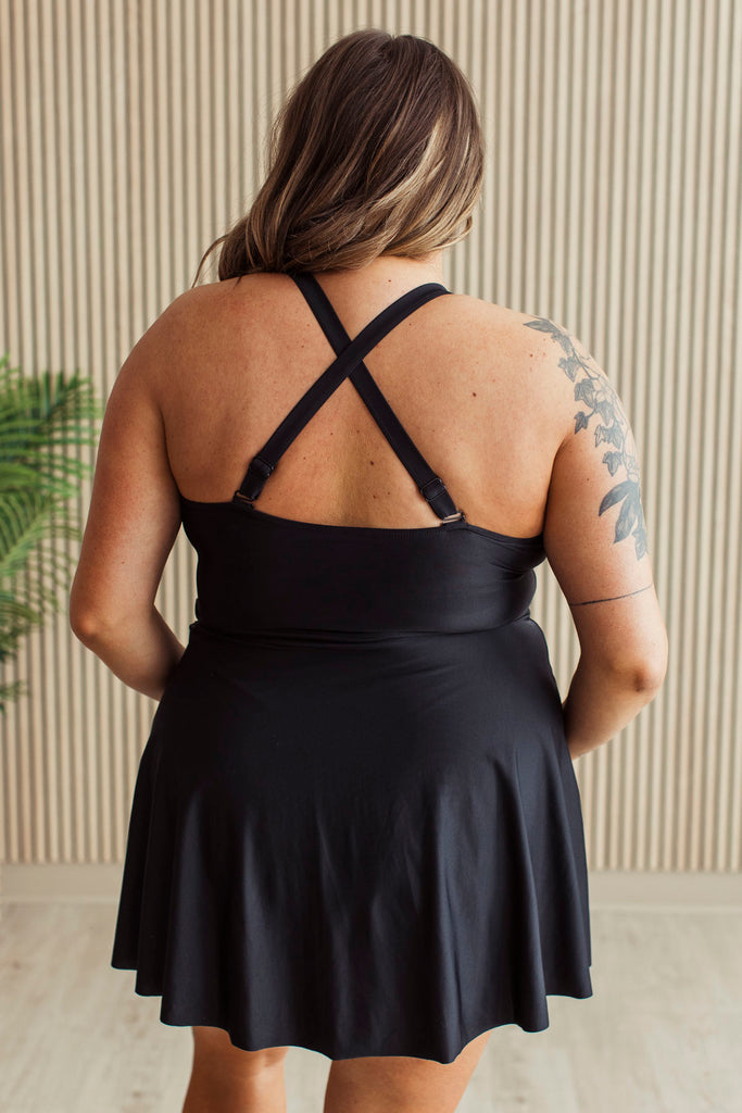 The Shimmering Waters Swim Dress is designed to flatter every body type with its elegant, forgiving silhouette. The luxurious black fabric catches the light beautifully, creating a shimmering effect that's both sophisticated and eye-catching. Perfect for poolside confidence or beach days, this dress combines comfort with timeless style. The thoughtful cut provides coverage and support while allowing you to move freely and feel gorgeous in your own skin.