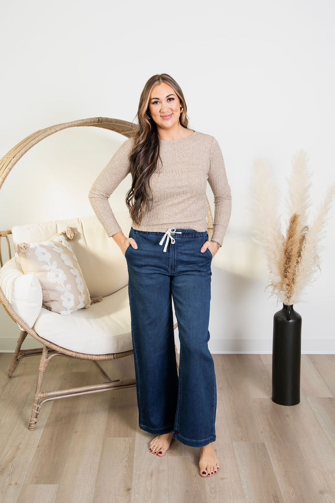 Effortlessly chic meets cozy comfort with these knit denim pants! Featuring a relaxed wide-leg silhouette and stretchy elastic waist, they're designed for all-day ease without sacrificing style. Crafted from the same buttery-soft material as our beloved Dex denim joggers, these pants offer that perfect blend of denim vibes and jogger comfort. Whether you're running errands or lounging at home, slip them on and feel the difference quality fabric makes. Your new go-to pair awaits!