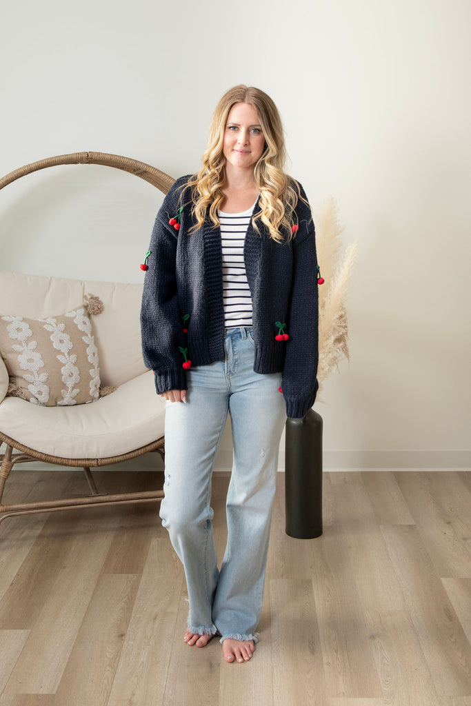Get ready to fall head over heels for this charming cardigan that's pure joy to wear. Crafted from irresistibly soft, chunky knit in a sophisticated navy blue, it features whimsical cherry-red details that spark conversation and smiles. Whether you're layering over a dress or throwing it on with your favorite jeans, this piece delivers comfort without compromising on style. It's the kind of cardigan that makes you want to curl up with a good book—or just about anything, really.