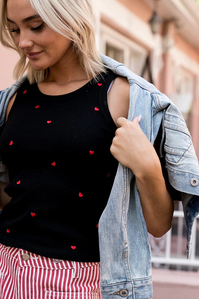 This ribbed tank top is the perfect mix of cute and charming. Tiny embroidered hearts scattered all over add a playful, flirty touch, while the soft ribbed fabric hugs comfortably for an easy, flattering fit. Layer it under your favorite cardigan, hoodie, or wear it on its own for a look that’s effortlessly sweet and endlessly wearable.