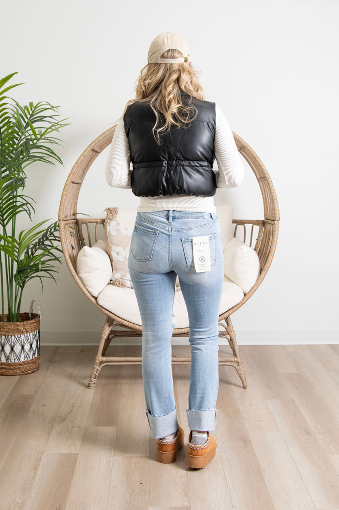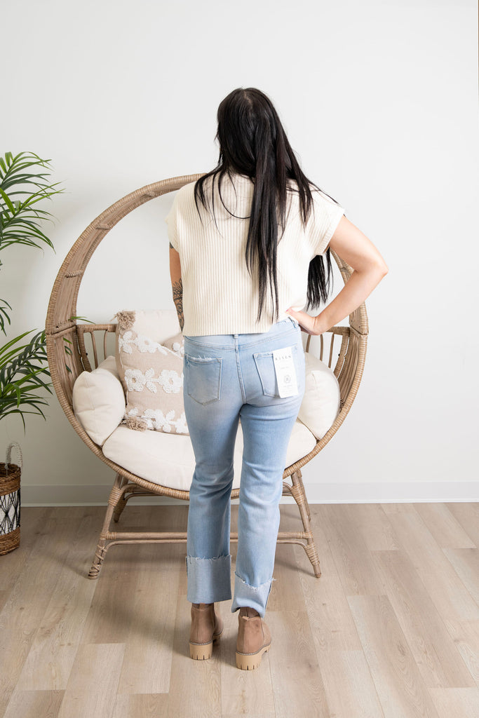 The Lainey Denim by Risen: a playful take on the classic denim. With an adorable light wash and a wide cuff that can be unrolled for extra length, these jeans are perfect for adding a touch of fun to your wardrobe.