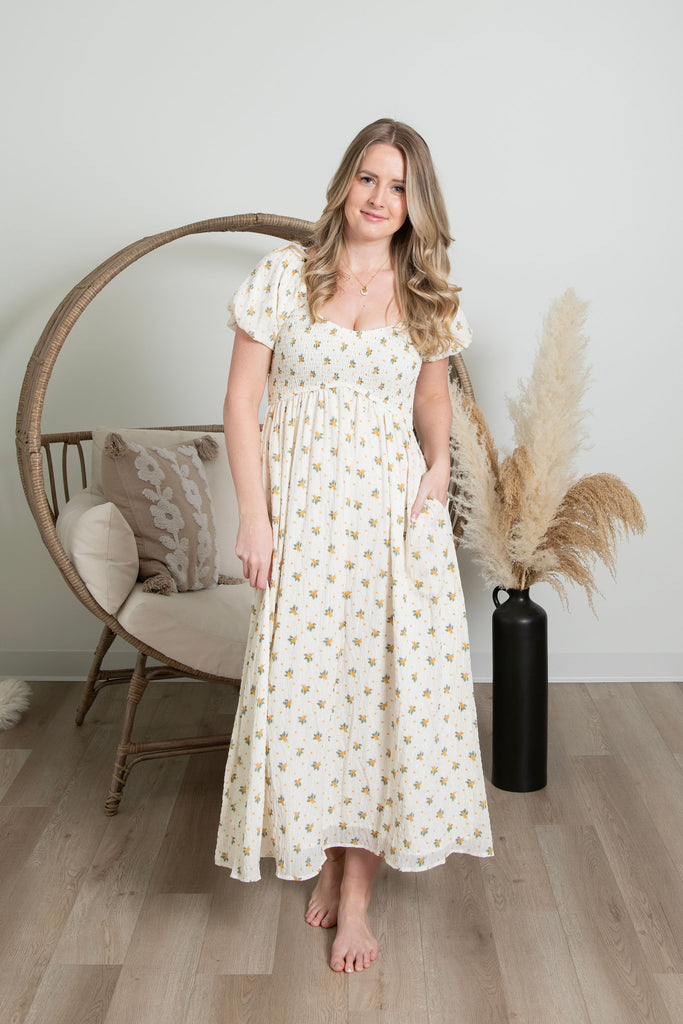 Get ready to turn heads in the Citrus Bloom Dress—where sunshine meets style! This playful white frock bursts with cheerful green and yellow flowers that'll have everyone asking where you got your glow-up. Those adorable puffy short sleeves? Pure feminine magic. Whether you're hitting a garden party, brunch with the girls, or just living your best life, this dress brings the fun and the freshness. It's the kind of piece that makes you smile every time you put it on. Your new favorite go-to for feeling fabulous and totally yourself.